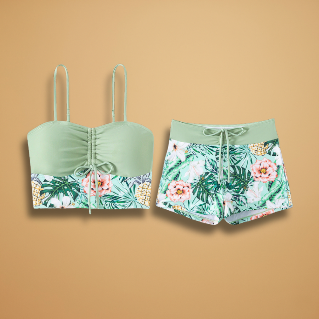 Women's Bikini Set with Ruching Detail, Adjustable Straps, and Matching Shorts