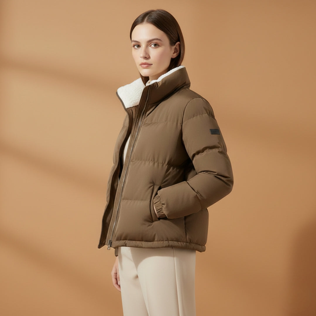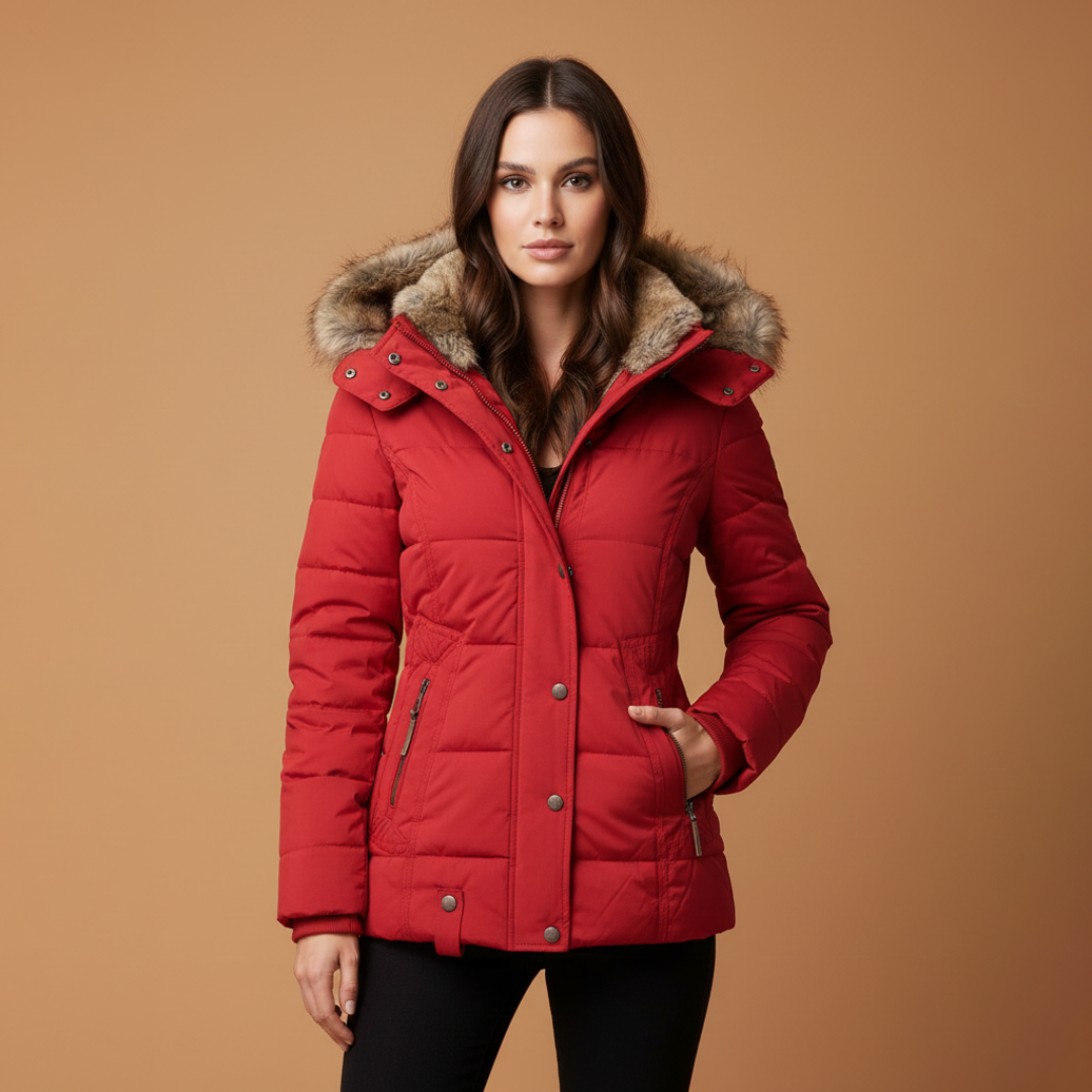 Women’s Puffer Jacket with Faux Fur Collar and Ribbed Cuffs
