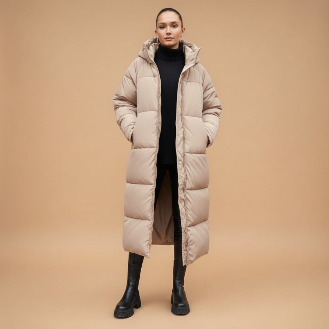 Women's Long Puffer Jacket with Hood and Quilted Surface