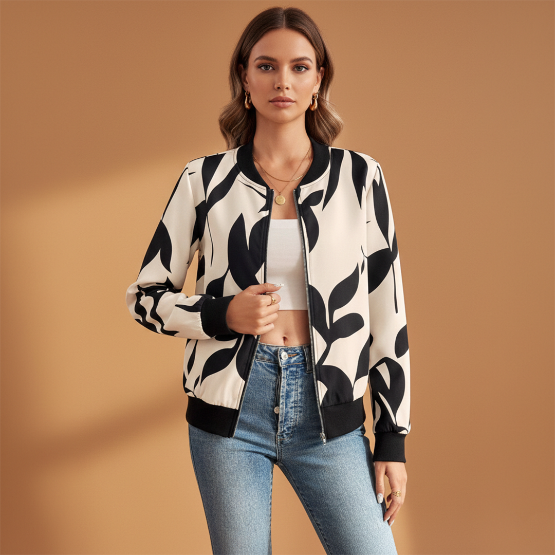 Women's Bomber Jacket with Zip Closure and Long Sleeves