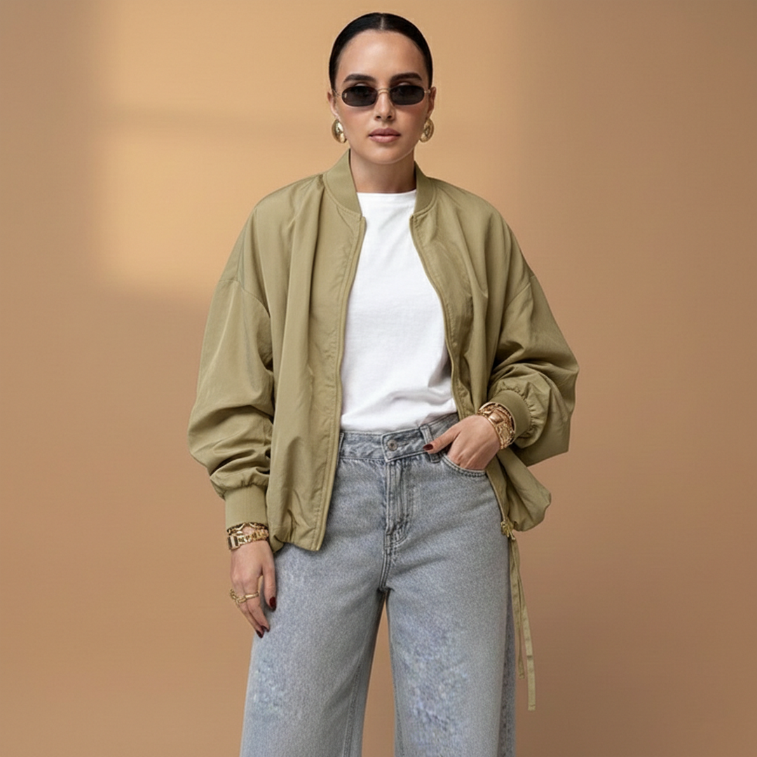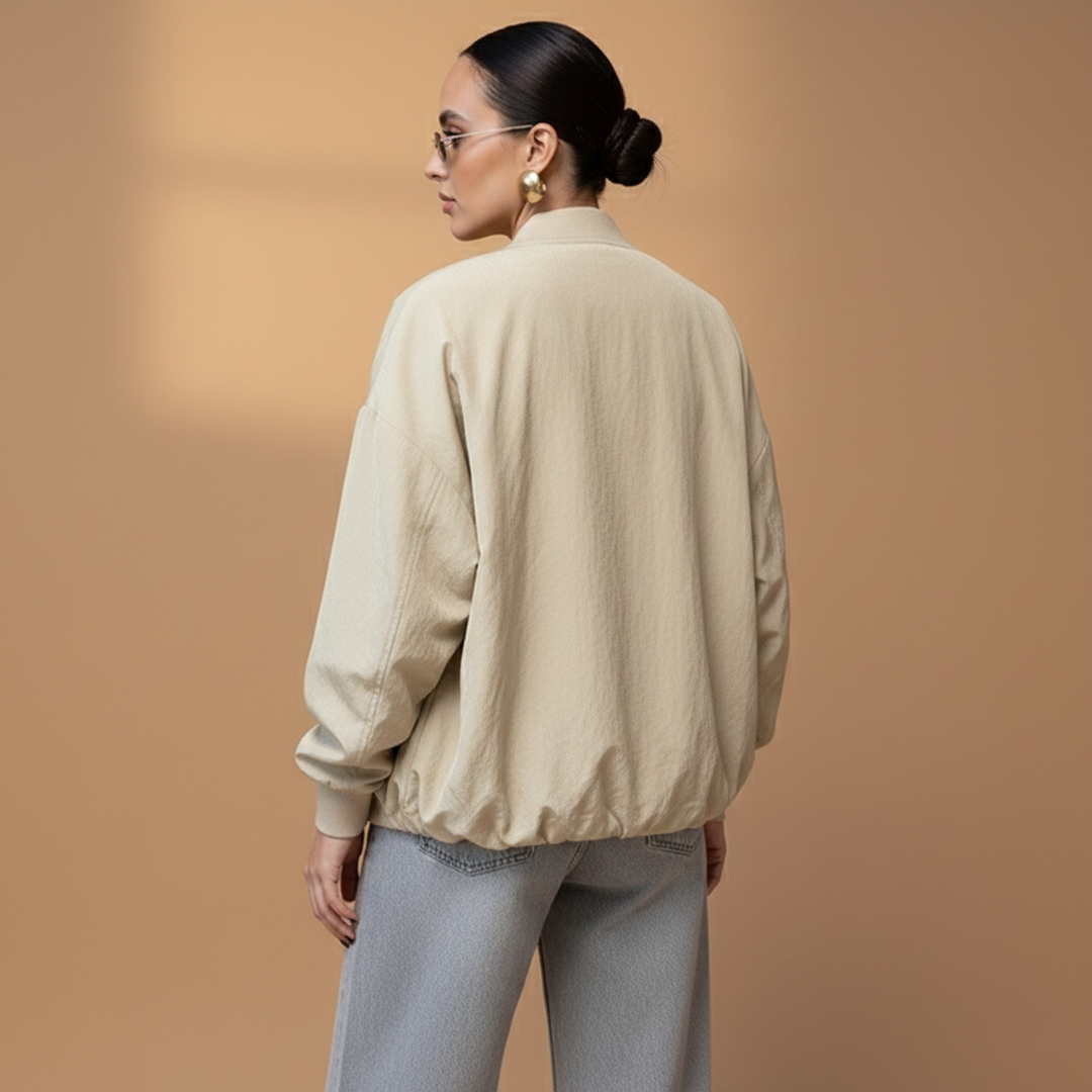 Women's Oversized Bomber Jacket with Zip Closure and Ribbed Cuffs