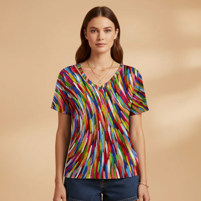 Women's T-shirt with V-neckline and Abstract Print Design