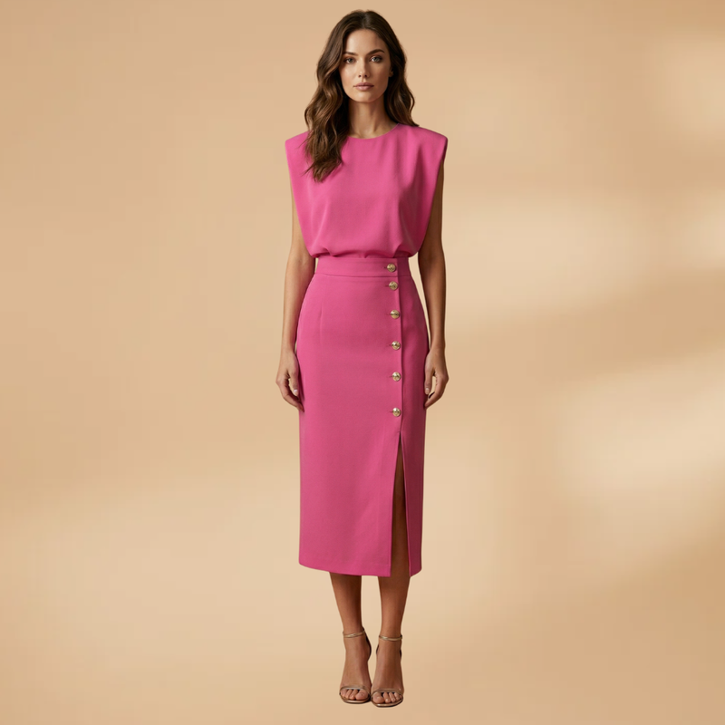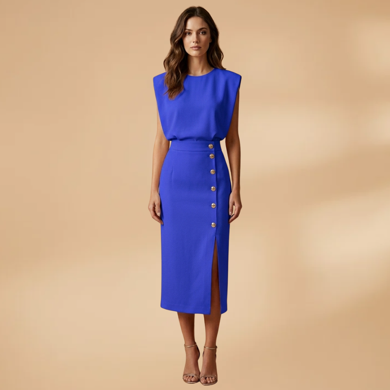 This women’s midi dress features a round neckline and short sleeves, forming a structured upper design. The defined waist adds shape to the silhouette, creating a balanced and fitted outline. The midi-length skirt extends below the knee and includes a front button slit, adding detail to the overall design.