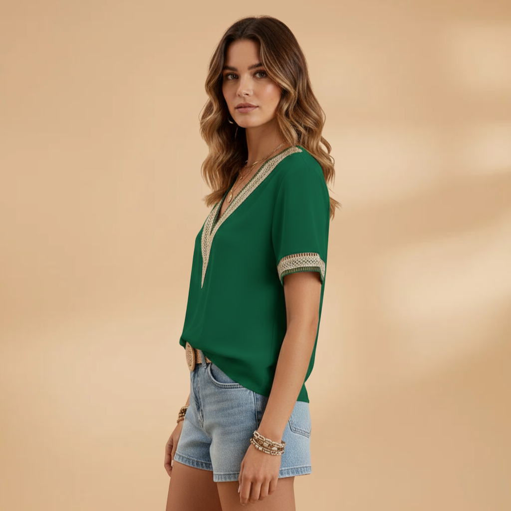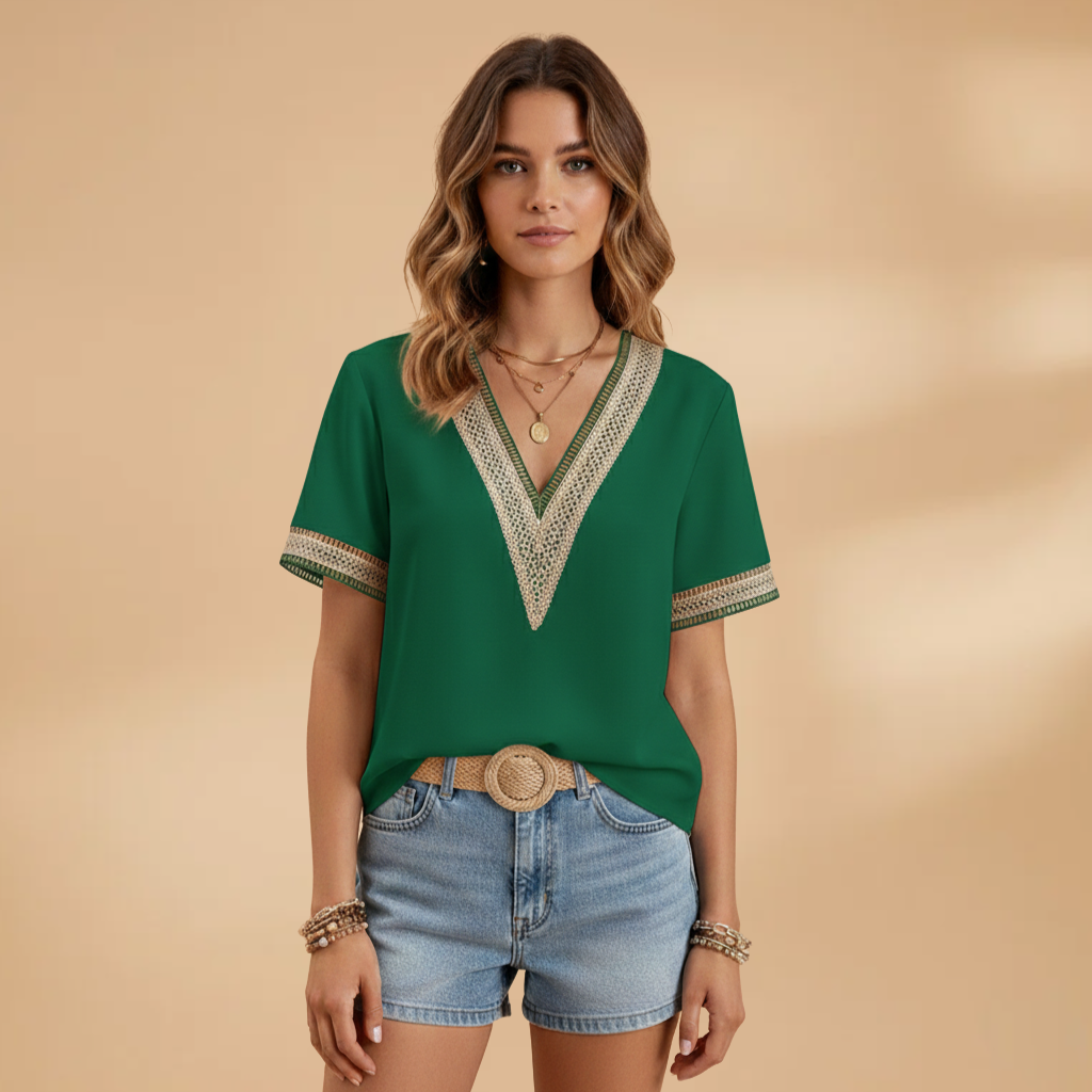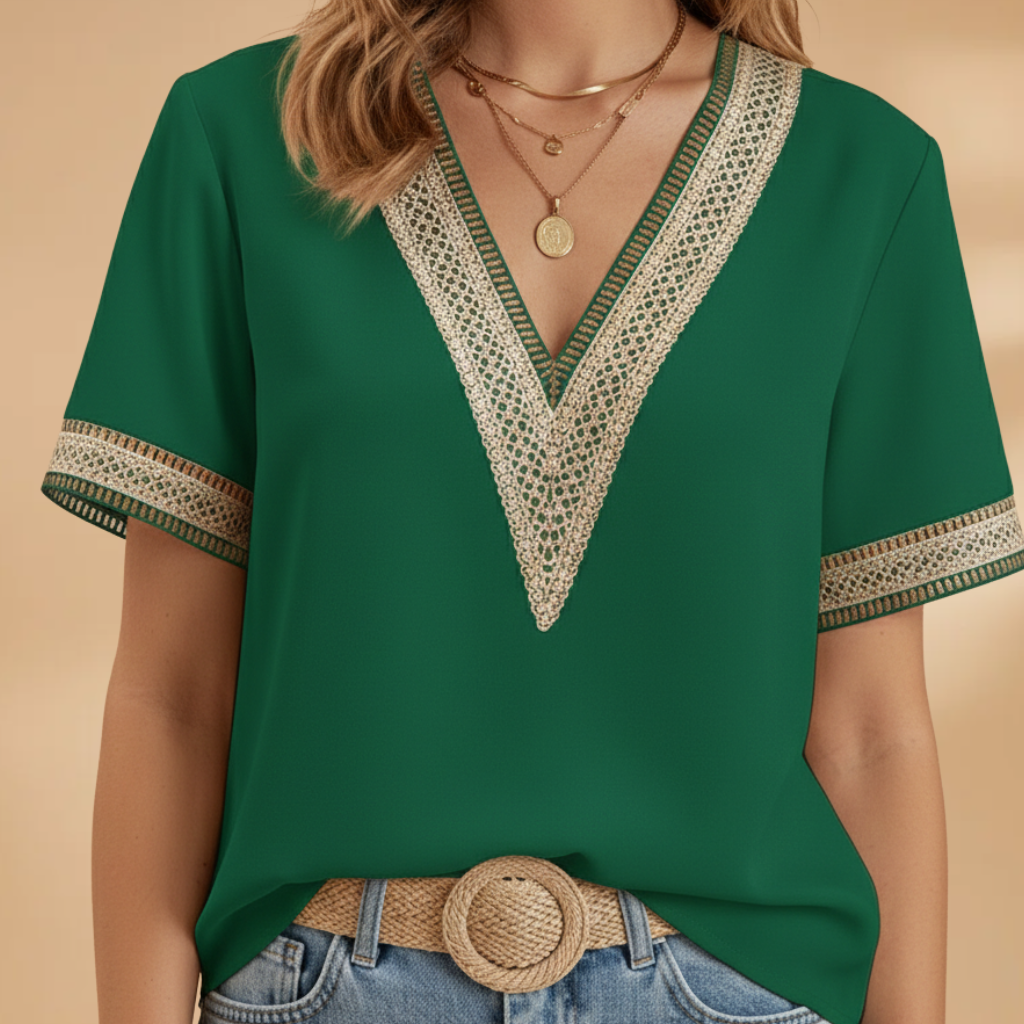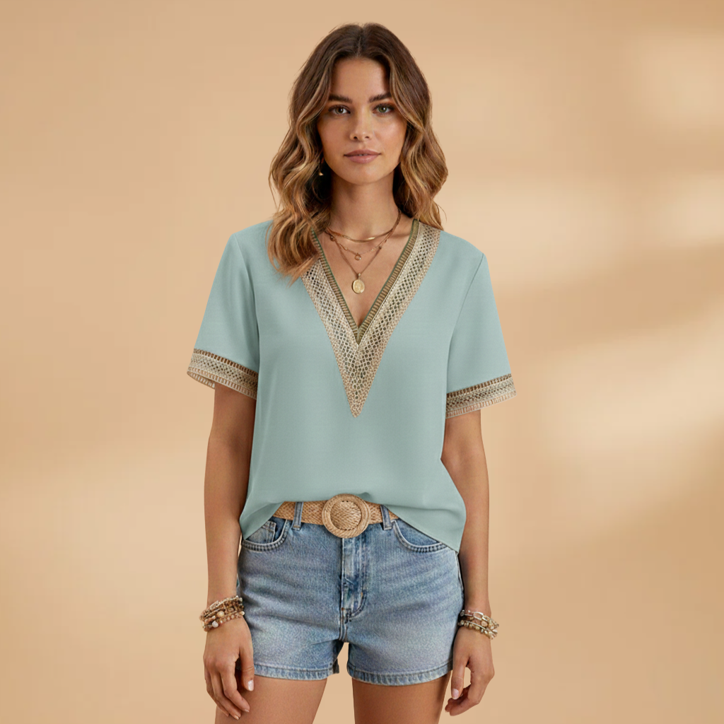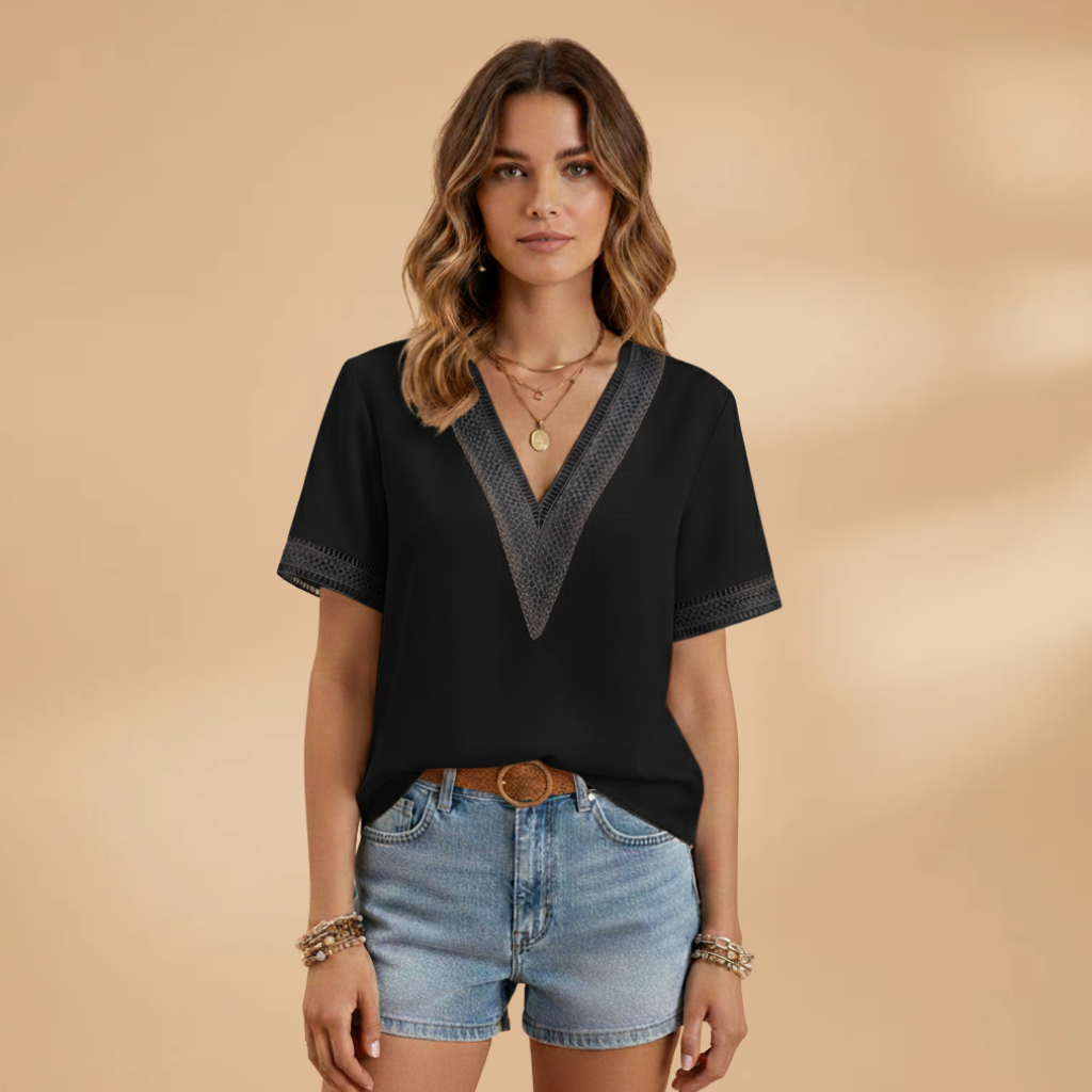 This women’s blouse features a V‑neck with detailed trim and short sleeves. The neckline leads to a structured shoulder seam and a straight hem. The cut follows the body shape, offering a clean design suited for all‑season wear.